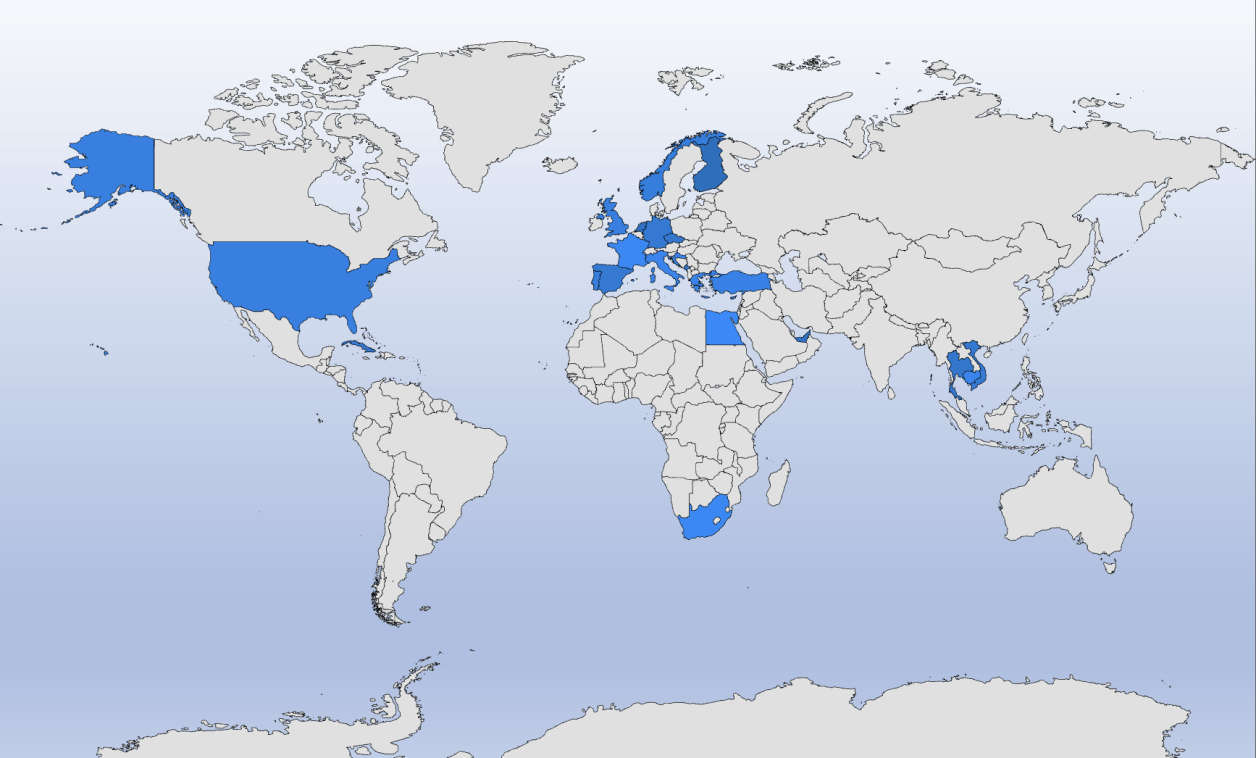 Finland, Frankreich, Griechenland, Italien, Kroatien, Türkei, Vereinigtes Königreich, Norwegen, Portugal, Spanien, Deutschland, Tschechische Republik, Montenegro, Niederlande, Zypern